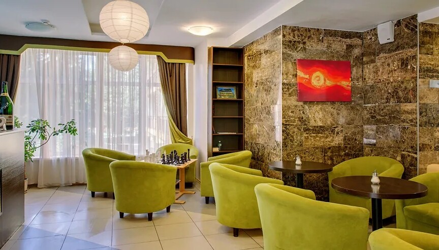 Лобби–бар отеля представляет собой современную деловую зону с кофейными картами, Wi-Fi и возможностью перекрестного бронирования, детской зоной и массажными креслами.