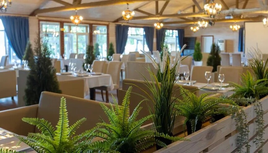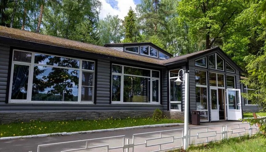 Отдельный банкетный зал с панорамным видом на Истринское водохранилище, выполненный из натурального дерева.