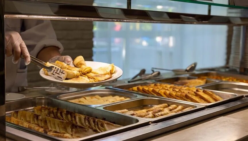 В меню «шведского стола» входят горячие и холодные блюда, разнообразные салаты, свежие овощи и фрукты, мясные и сырные нарезки, вкусная выпечка, десерты, соки и горячие напитки.